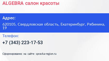 ALGEBRA, салон красоты по адресу 620105, Свердловская область, Екатеринбург, Рябинина, 19 в дальнейшем Организация, размещена в следующих категориях: