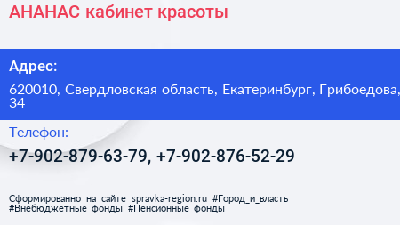 АНАНАС, кабинет красоты по адресу 620010, Свердловская область, Екатеринбург, Грибоедова, 34 в дальнейшем Организация, размещена в следующих категориях: