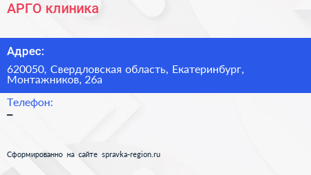 АРГО, клиника по адресу 620050, Свердловская область, Екатеринбург, Монтажников, 26а в дальнейшем Организация, размещена в следующих категориях: