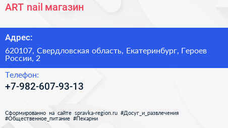 ART-nail, магазин по адресу 620107, Свердловская область, Екатеринбург, Героев России, 2 в дальнейшем Организация, размещена в следующих категориях: