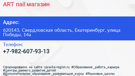 ART-nail, магазин по адресу 620143, Свердловская область, Екатеринбург, улица Победы, 14а в дальнейшем Организация, размещена в следующих категориях: