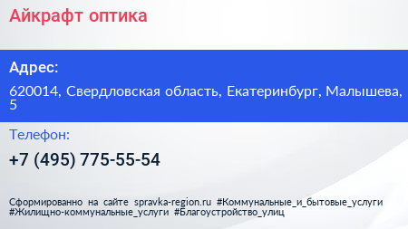 Айкрафт, оптика по адресу 620014, Свердловская область, Екатеринбург, Малышева, 5 в дальнейшем Организация, размещена в следующих категориях:
