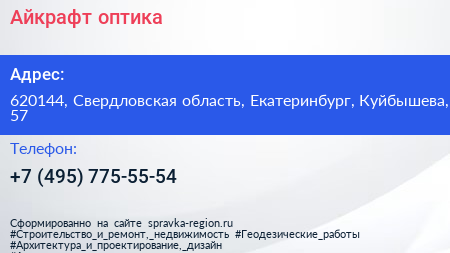 Айкрафт, оптика по адресу 620144, Свердловская область, Екатеринбург, Куйбышева, 57 в дальнейшем Организация, размещена в следующих категориях: