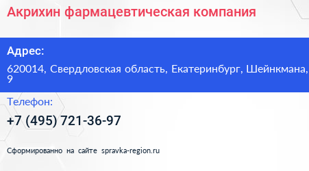 Акрихин, фармацевтическая компания по адресу 620014, Свердловская область, Екатеринбург, Шейнкмана, 9 в дальнейшем Организация, размещена в следующих категориях: