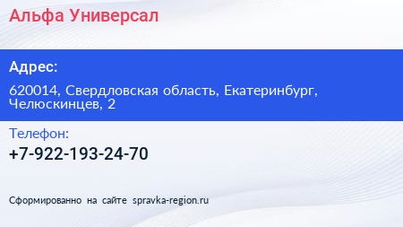 Альфа-Универсал по адресу 620014, Свердловская область, Екатеринбург, Челюскинцев, 2 в дальнейшем Организация, размещена в следующих категориях: