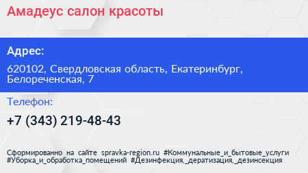 Амадеус, салон красоты по адресу 620102, Свердловская область, Екатеринбург, Белореченская, 7 в дальнейшем Организация, размещена в следующих категориях: