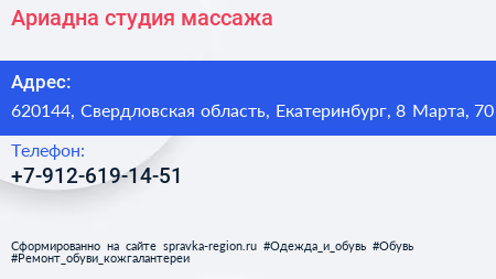 Ариадна, студия массажа по адресу 620144, Свердловская область, Екатеринбург, 8 Марта, 70 в дальнейшем Организация, размещена в следующих категориях: