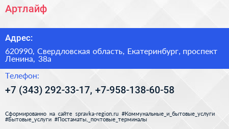 Артлайф по адресу 620990, Свердловская область, Екатеринбург, проспект Ленина, 38а в дальнейшем Организация, размещена в следующих категориях: