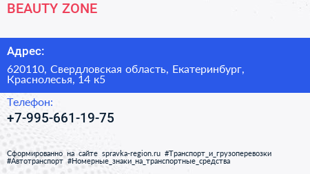 BEAUTY ZONE по адресу 620110, Свердловская область, Екатеринбург, Краснолесья, 14 к5 в дальнейшем Организация, размещена в следующих категориях:
