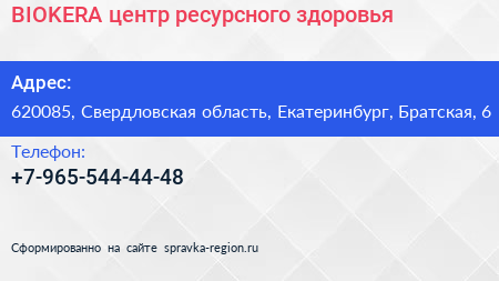 BIOKERA, центр ресурсного здоровья по адресу 620085, Свердловская область, Екатеринбург, Братская, 6 в дальнейшем Организация, размещена в следующих категориях: