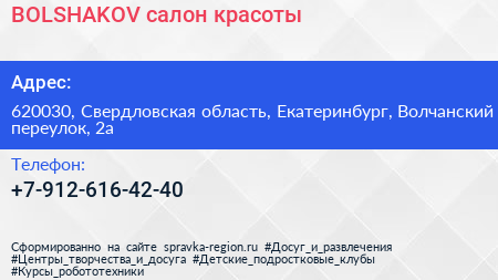 BOLSHAKOV, салон красоты по адресу 620030, Свердловская область, Екатеринбург, Волчанский переулок, 2а в дальнейшем Организация, размещена в следующих категориях: