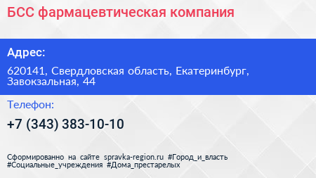 БСС, фармацевтическая компания по адресу 620141, Свердловская область, Екатеринбург, Завокзальная, 44 в дальнейшем Организация, размещена в следующих категориях: