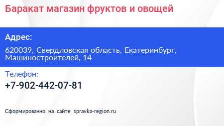 Баракат, магазин фруктов и овощей по адресу 620039, Свердловская область, Екатеринбург, Машиностроителей, 14 в дальнейшем Организация, размещена в следующих категориях: