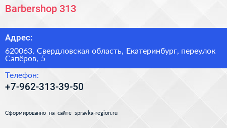 Barbershop 313 по адресу 620063, Свердловская область, Екатеринбург, переулок Сапёров, 5 в дальнейшем Организация, размещена в следующих категориях: