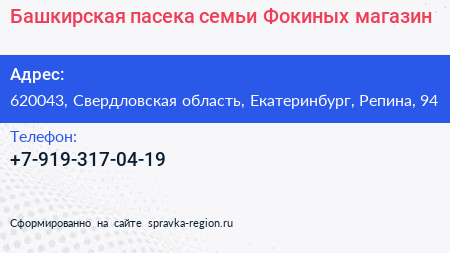 Башкирская пасека семьи Фокиных, магазин по адресу 620043, Свердловская область, Екатеринбург, Репина, 94 в дальнейшем Организация, размещена в следующих категориях: