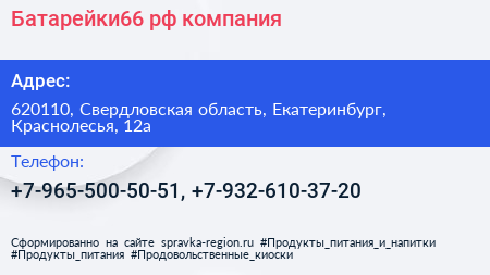 Батарейки66.рф, компания по адресу 620110, Свердловская область, Екатеринбург, Краснолесья, 12а в дальнейшем Организация, размещена в следующих категориях: