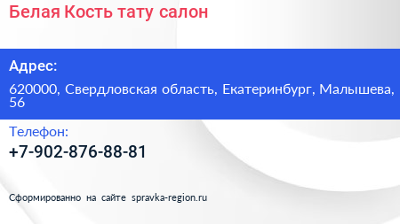Белая Кость, тату-салон по адресу 620000, Свердловская область, Екатеринбург, Малышева, 56 в дальнейшем Организация, размещена в следующих категориях: