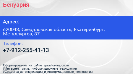 Бенуария по адресу 620043, Свердловская область, Екатеринбург, Металлургов, 87 в дальнейшем Организация, размещена в следующих категориях:
