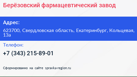 Берёзовский фармацевтический завод по адресу 623700, Свердловская область, Екатеринбург, Кольцевая, 13а в дальнейшем Организация, размещена в следующих категориях: