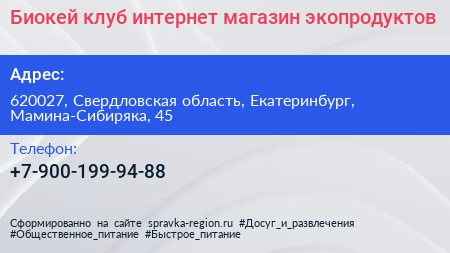Биокей клуб, интернет-магазин экопродуктов по адресу 620027, Свердловская область, Екатеринбург, Мамина-Сибиряка, 45 в дальнейшем Организация, размещена в следующих категориях: