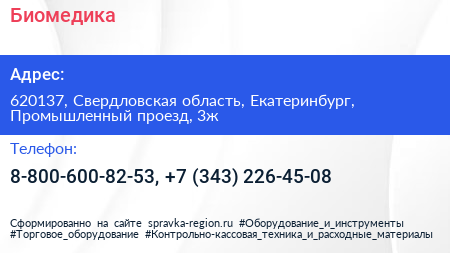 Биомедика по адресу 620137, Свердловская область, Екатеринбург, Промышленный проезд, 3ж в дальнейшем Организация, размещена в следующих категориях: