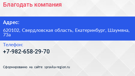Благодать, компания по адресу 620102, Свердловская область, Екатеринбург, Шаумяна, 73а в дальнейшем Организация, размещена в следующих категориях: