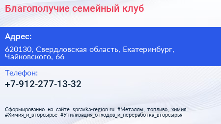 Благополучие, семейный клуб по адресу 620130, Свердловская область, Екатеринбург, Чайковского, 66 в дальнейшем Организация, размещена в следующих категориях: