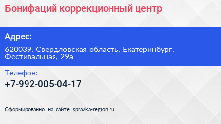 Бонифаций, коррекционный центр по адресу 620039, Свердловская область, Екатеринбург, Фестивальная, 29а в дальнейшем Организация, размещена в следующих категориях: