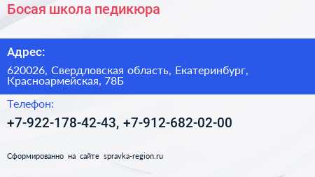 Босая, школа педикюра по адресу 620026, Свердловская область, Екатеринбург, Красноармейская, 78Б в дальнейшем Организация, размещена в следующих категориях: