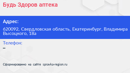 Будь Здоров, аптека по адресу 620092, Свердловская область, Екатеринбург, Владимира Высоцкого, 18а в дальнейшем Организация, размещена в следующих категориях:
