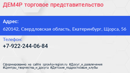 ДЕМ4Р, торговое представительство по адресу 620142, Свердловская область, Екатеринбург, Щорса, 56 в дальнейшем Организация, размещена в следующих категориях: