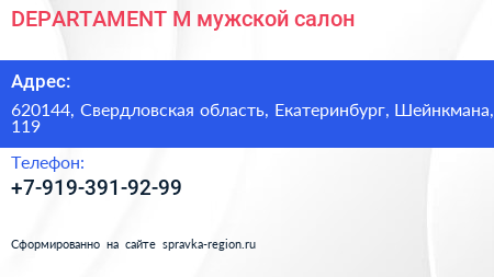 DEPARTAMENT M, мужской салон по адресу 620144, Свердловская область, Екатеринбург, Шейнкмана, 119 в дальнейшем Организация, размещена в следующих категориях: