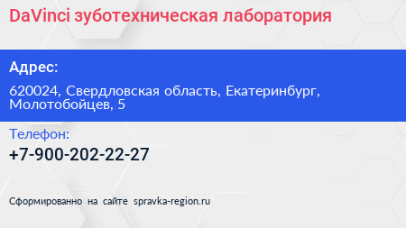 DaVinci, зуботехническая лаборатория по адресу 620024, Свердловская область, Екатеринбург, Молотобойцев, 5 в дальнейшем Организация, размещена в следующих категориях: