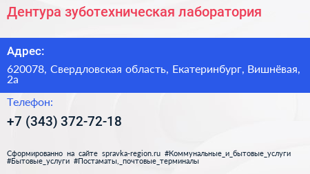 Дентура, зуботехническая лаборатория по адресу 620078, Свердловская область, Екатеринбург, Вишнёвая, 2а в дальнейшем Организация, размещена в следующих категориях: