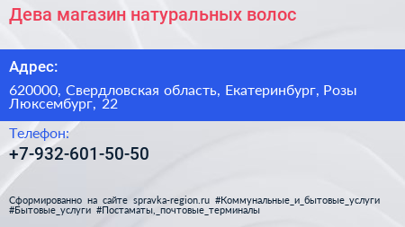 Дева, магазин натуральных волос по адресу 620000, Свердловская область, Екатеринбург, Розы Люксембург, 22 в дальнейшем Организация, размещена в следующих категориях: