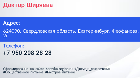 Доктор Ширяева по адресу 624090, Свердловская область, Екатеринбург, Феофанова, 2г в дальнейшем Организация, размещена в следующих категориях: