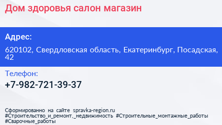 Дом здоровья, салон-магазин по адресу 620102, Свердловская область, Екатеринбург, Посадская, 42 в дальнейшем Организация, размещена в следующих категориях: