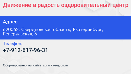 Движение в радость, оздоровительный центр по адресу 620062, Свердловская область, Екатеринбург, Генеральская, 6 в дальнейшем Организация, размещена в следующих категориях: