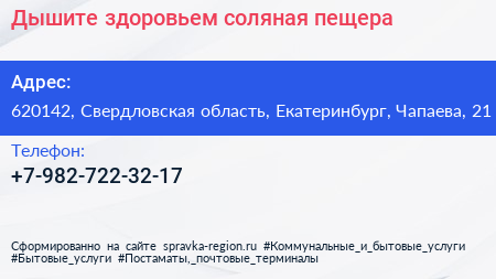 Дышите здоровьем, соляная пещера по адресу 620142, Свердловская область, Екатеринбург, Чапаева, 21 в дальнейшем Организация, размещена в следующих категориях:
