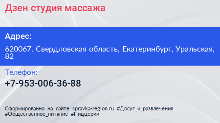 Дзен, студия массажа по адресу 620067, Свердловская область, Екатеринбург, Уральская, 82 в дальнейшем Организация, размещена в следующих категориях: