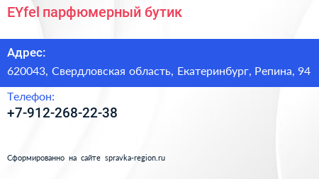 EYfel, парфюмерный бутик по адресу 620043, Свердловская область, Екатеринбург, Репина, 94 в дальнейшем Организация, размещена в следующих категориях: