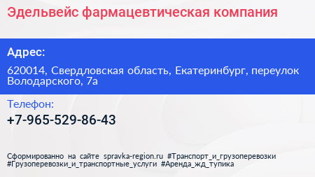 Эдельвейс, фармацевтическая компания по адресу 620014, Свердловская область, Екатеринбург, переулок Володарского, 7а в дальнейшем Организация, размещена в следующих категориях: