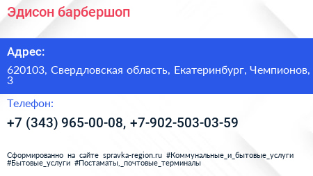 Эдисон, барбершоп по адресу 620103, Свердловская область, Екатеринбург, Чемпионов, 3 в дальнейшем Организация, размещена в следующих категориях:
