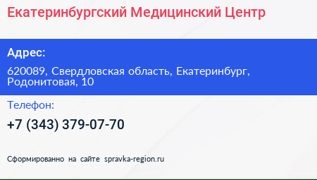Екатеринбургский Медицинский Центр по адресу 620089, Свердловская область, Екатеринбург, Родонитовая, 10 в дальнейшем Организация, размещена в следующих категориях:
