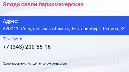 Элоди, салон-парикмахерская по адресу 620043, Свердловская область, Екатеринбург, Репина, 84 в дальнейшем Организация, размещена в следующих категориях: