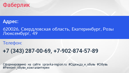 Фаберлик по адресу 620026, Свердловская область, Екатеринбург, Розы Люксембург, 49 в дальнейшем Организация, размещена в следующих категориях: