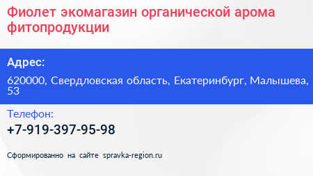 Фиолет, экомагазин органической арома-фитопродукции по адресу 620000, Свердловская область, Екатеринбург, Малышева, 53 в дальнейшем Организация, размещена в следующих категориях: