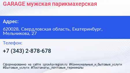 GARAGE, мужская парикмахерская по адресу 620028, Свердловская область, Екатеринбург, Мельникова, 27 в дальнейшем Организация, размещена в следующих категориях: