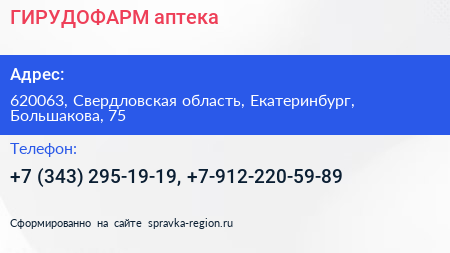 ГИРУДОФАРМ, аптека по адресу 620063, Свердловская область, Екатеринбург, Большакова, 75 в дальнейшем Организация, размещена в следующих категориях: