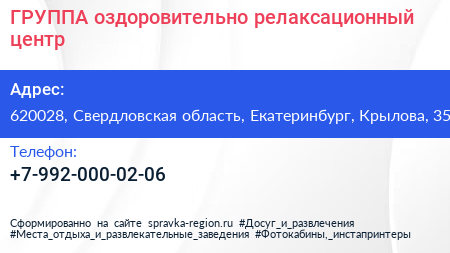 ГРУППА, оздоровительно-релаксационный центр по адресу 620028, Свердловская область, Екатеринбург, Крылова, 35 в дальнейшем Организация, размещена в следующих категориях: